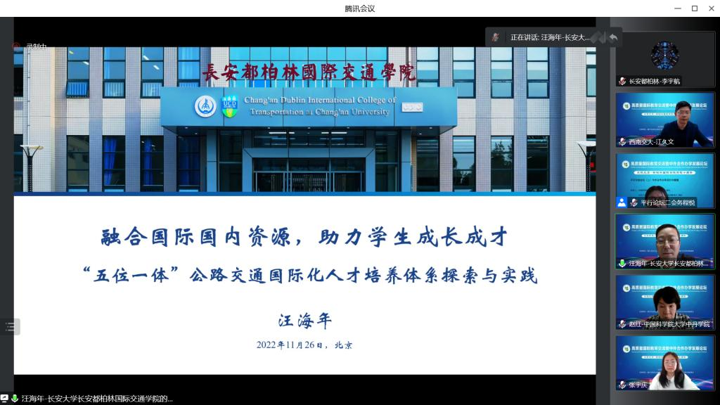 On November 26, the Forum of "High-quality International Education Exchange and Sino-Foreign Cooperative Education Development" was successfully held at Beijing University of Technology.This online forum aims to actively promote international educational exchanges and the high-quality development of Sino-foreign cooperative education, and cultivate a large number of innovative composite talents with global vision, national feelings and ability to participate in international competition and cooperation for the process of Chinese modernization.Professor Fan Wen, Vice President of Chang 'an University, was invited to preside over the parallel sub-forum of "Talent Training and Quality Assurance in Sino-Foreign Cooperative Education". Professor Wang Hainian,Dean of CDIC, was invited to deliver a special report of "Exploration and Practice of 'Five-dimension Integrated' International Talent Training System for Highway Transportation". All faculty members of the college participated in the forum online.