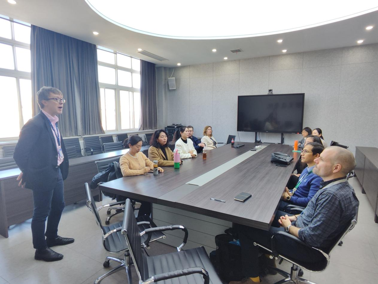 于鸿远四楼会议室召开学院英语教师教学座谈会。会议邀请爱尔兰都柏林大学英语与全球语言中心主任Anna Nunan 博士与学院中外英语教师针对学术英语教学开展交流讨论,学院英语课程负责人 Alex Ruchman 博士主持会议,中外英语教师围绕学术英语课程建设、学生学习特点及AI时代教学应对策略等重点议题展开深入研讨。