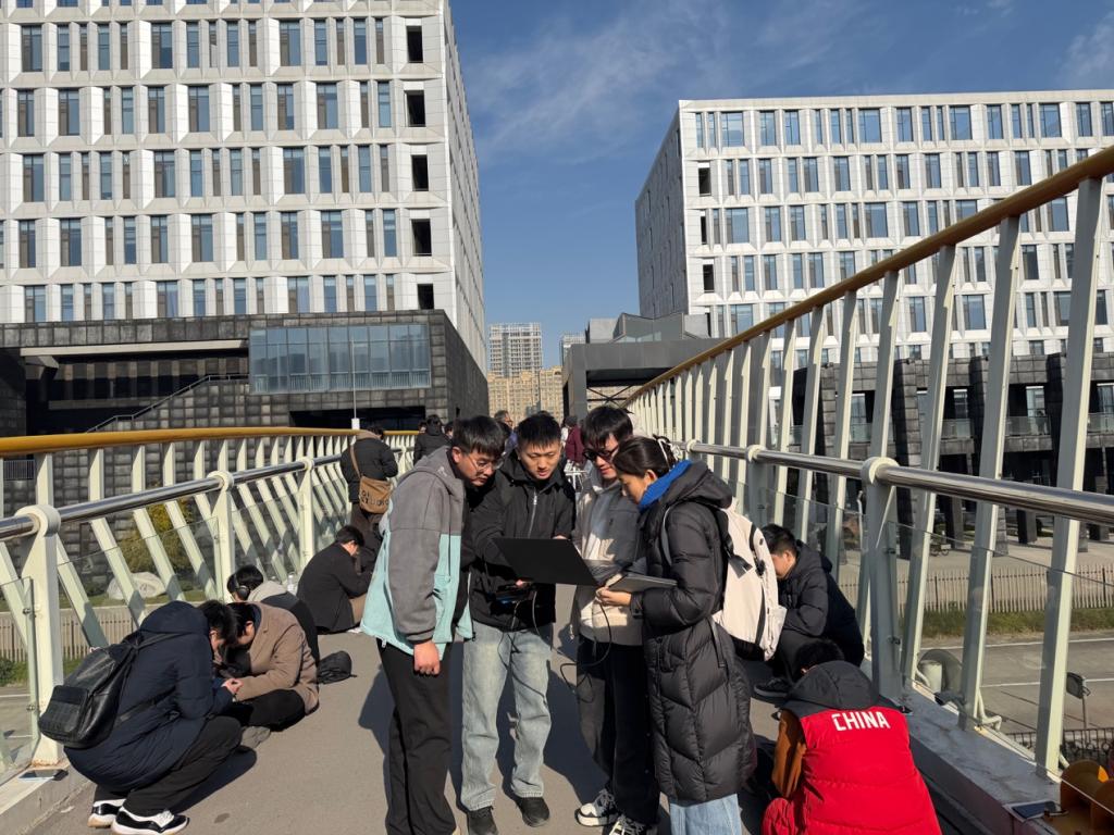 活动当天,Ekin Ozer介绍了桥梁环境激励测试的背景和流程。学生按照分组完成测点确认后,分别使用Sensor Logger软件、有线和无线加速度传感器同步开展数据采集,共完成三轮25分钟的持续采样。